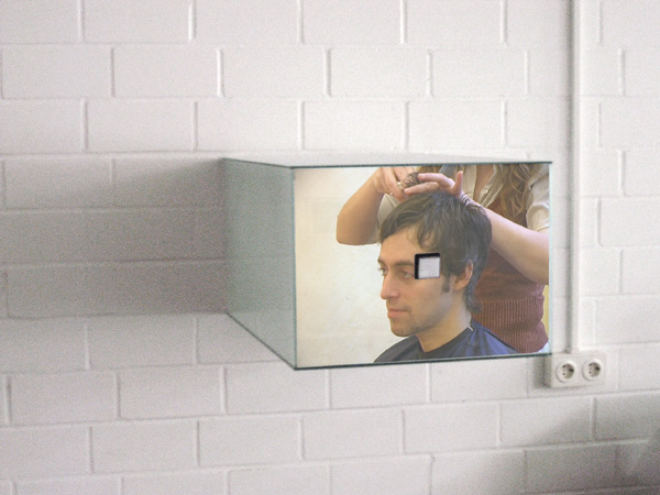 Visiting a hairdresser is an everyday activity with the aim of varying and forming your individual appearance. Cutting hair is a cultural activity. In the work "Impulse Image Hairdresser" it was the ritualised process of washing, cutting, blow-drying, styling etc. which determined the structure of the video takes which show me in the process of having my hair cut. The video footage was compiled in four video sequences, three of which show the preparation and waiting. These sequences are played in a loop in the video sculpture, the order varied by a random generator. A push-button in the middle of the video image invites the viewer to approach the sculpture and activate it. If the button is activated the fourth video sequence of my hair being cut is played. It is only through the interaction of the audience that they can see how my appearance is changed. Whereas initially the player "performs" the work it is the viewer who determines the continuation of the activity and therefore the narration. The viewer provides the "impulse" for a performative reception. The work poses the question: "When do I feel the impulse to press the button? At what point in time do I want to interrupt the endless loop, provoke a change?" In the sculpture "Impulse Image Hairdresser" the genre of the self-portrait is investigated, in that a new form is found for it using electronic media. The footage is not recorded in a photographic or film studio but rather in a hairdressing salon. In this way a process, which is usually a preparatory step for a portrait - the cultivation of the outer appearance - becomes the actual portrait. This activity is coupled with the interaction of the viewer. The invitation to interact with the work disrupts the viewing of the video images, as the push-button which activates the fourth sequence is mounted in the middle of the screen. The large flashing button is an important part of the video sculpture not only because of its function but also because of its physical presence. The self-portrait is not produced by finding certain images (photos, videos) rather through a connection between its process of creation and a simple interactive functionality. This connection between the process of creation and the disruptive user interface questions the correlation between the self-portrait and the desire for feedback.