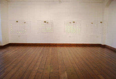 Bei der Arbeit "Living in a Box" handelt es sich um eine leuchtende Installation aus PVC-Folie und kleinen Leuchtdioden. Bei näherer Betrachtung kann man erkennen, dass jede Folie mit ihren 35 Lichtpunkten als durchsichtiger Bildschirm bilden. Bevor das, was auf dem Bildschirm dargestellt ist, erkannt wird, ist also ein großes Maß an Abstraktionsvermögen gefordert. Ein Abstraktionsvermögen, das es ermöglicht, in dieser ungewöhnlichen Struktur aus Folie, Verkabelung, Mikrokontroller und Leuchtdioden ein Display zu sehen. Der Blick auf den Bildschirm erhält somit eine neue Qualität: Die Präsens des Bildschirmes selbst wird - auch im ausgeschalteten Zustand - zu einer sinnlichen Erfahrung. In der Arbeit "Living in a Box" wird das Medium selbst gestaltet und hinterfragt. Das, was von dem Medium vermittelt wird, in diesem Fall handelt es sich um ein minimales Computerspiel, steht also nicht wie üblich allein im Zentrum der Betrachtung, sondern wird mit der technischen Apparatur in Einklang gebracht.