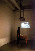 in Form einer Videoprojektion an der Wand. Vor der Projektionsfläche steht